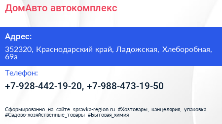 ДомАвто, автокомплекс по адресу 352320, Краснодарский край, Ладожская, Хлеборобная, 69а в дальнейшем Организация, размещена в следующих категориях: