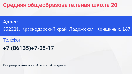 Средняя общеобразовательная школа №20 по адресу 352321, Краснодарский край, Ладожская, Коншиных, 167 в дальнейшем Организация, размещена в следующих категориях: