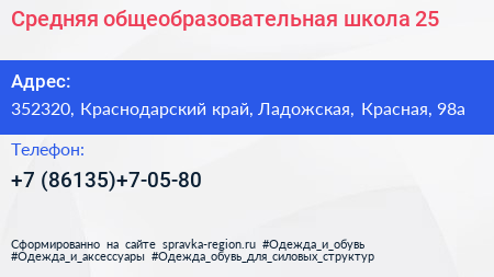 Средняя общеобразовательная школа №25 по адресу 352320, Краснодарский край, Ладожская, Красная, 98а в дальнейшем Организация, размещена в следующих категориях: