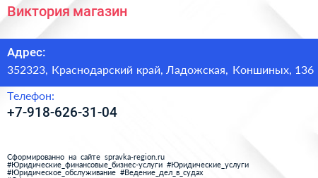 Виктория, магазин по адресу 352323, Краснодарский край, Ладожская, Коншиных, 136 в дальнейшем Организация, размещена в следующих категориях: