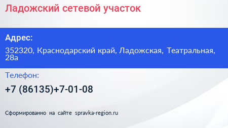 Ладожский сетевой участок по адресу 352320, Краснодарский край, Ладожская, Театральная, 28а в дальнейшем Организация, размещена в следующих категориях: