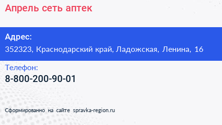 Апрель, сеть аптек по адресу 352323, Краснодарский край, Ладожская, Ленина, 16 в дальнейшем Организация, размещена в следующих категориях: