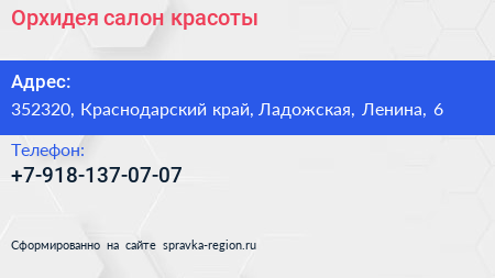 Орхидея, салон красоты по адресу 352320, Краснодарский край, Ладожская, Ленина, 6 в дальнейшем Организация, размещена в следующих категориях: