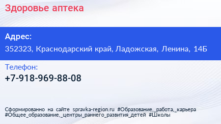 Здоровье, аптека по адресу 352323, Краснодарский край, Ладожская, Ленина, 14Б в дальнейшем Организация, размещена в следующих категориях: