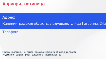 Априори, гостиница по адресу Калининградская область, Ладушкин, улица Гагарина, 24а в дальнейшем Организация, размещена в следующих категориях: