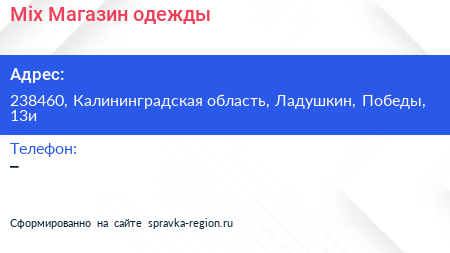 Mix, Магазин одежды по адресу 238460, Калининградская область, Ладушкин, Победы, 13и в дальнейшем Организация, размещена в следующих категориях: