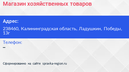 Магазин хозяйственных товаров по адресу 238460, Калининградская область, Ладушкин, Победы, 13г в дальнейшем Организация, размещена в следующих категориях: