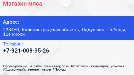 Магазин мяса по адресу 238460, Калининградская область, Ладушкин, Победы, 11в киоск в дальнейшем Организация, размещена в следующих категориях: