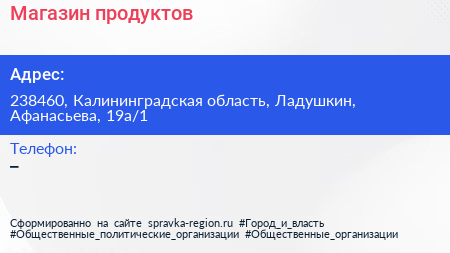 Магазин продуктов по адресу 238460, Калининградская область, Ладушкин, Афанасьева, 19а/1 в дальнейшем Организация, размещена в следующих категориях:
