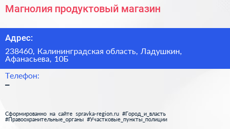 Магнолия, продуктовый магазин по адресу 238460, Калининградская область, Ладушкин, Афанасьева, 10Б в дальнейшем Организация, размещена в следующих категориях: