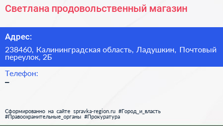 Светлана, продовольственный магазин по адресу 238460, Калининградская область, Ладушкин, Почтовый переулок, 2Б в дальнейшем Организация, размещена в следующих категориях: