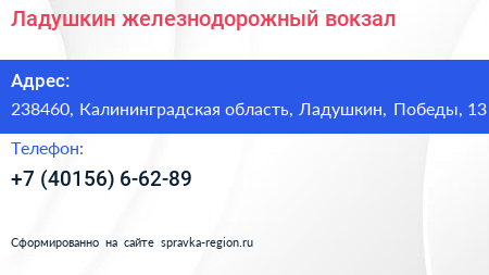 Ладушкин, железнодорожный вокзал по адресу 238460, Калининградская область, Ладушкин, Победы, 13 в дальнейшем Организация, размещена в следующих категориях: