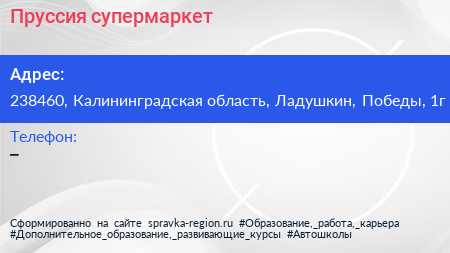 Пруссия, супермаркет по адресу 238460, Калининградская область, Ладушкин, Победы, 1г в дальнейшем Организация, размещена в следующих категориях: