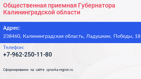 Общественная приемная Губернатора Калининградской области по адресу 238460, Калининградская область, Ладушкин, Победы, 18 в дальнейшем Организация, размещена в следующих категориях: