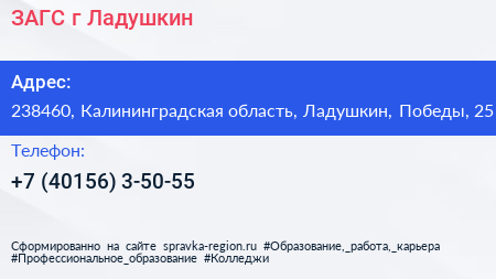 ЗАГС, г. Ладушкин по адресу 238460, Калининградская область, Ладушкин, Победы, 25 в дальнейшем Организация, размещена в следующих категориях: