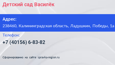 Детский сад Василёк по адресу 238460, Калининградская область, Ладушкин, Победы, 1а в дальнейшем Организация, размещена в следующих категориях: