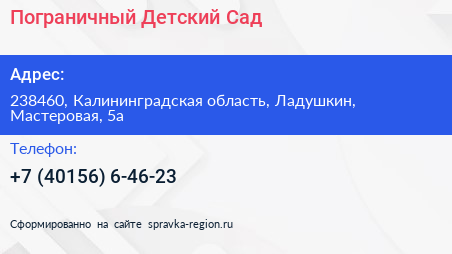Пограничный Детский Сад по адресу 238460, Калининградская область, Ладушкин, Мастеровая, 5а в дальнейшем Организация, размещена в следующих категориях: