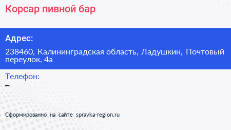 Корсар, пивной бар по адресу 238460, Калининградская область, Ладушкин, Почтовый переулок, 4а в дальнейшем Организация, размещена в следующих категориях: