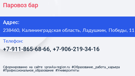Паровоз, бар по адресу 238460, Калининградская область, Ладушкин, Победы, 11 в дальнейшем Организация, размещена в следующих категориях: