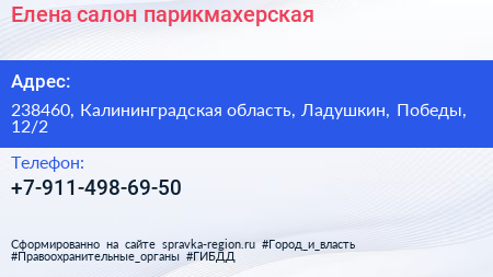 Елена, салон-парикмахерская по адресу 238460, Калининградская область, Ладушкин, Победы, 12/2 в дальнейшем Организация, размещена в следующих категориях: