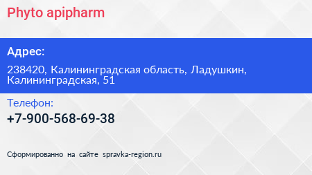 Phyto-apipharm по адресу 238420, Калининградская область, Ладушкин, Калининградская, 51 в дальнейшем Организация, размещена в следующих категориях: