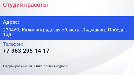 Студия красоты по адресу 238460, Калининградская область, Ладушкин, Победы, 13д в дальнейшем Организация, размещена в следующих категориях: