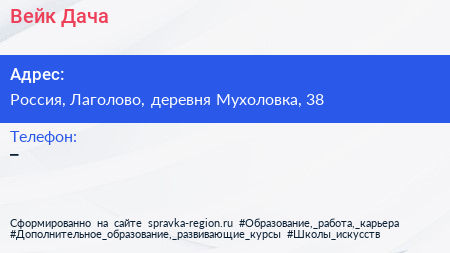 Вейк Дача по адресу 175, Солнечная улица, КП Подсолнухи, Мухоловка, Лаголовское сельское поселение, Ломоносовский район, Ленинградская область, Северо-Западный федеральный округ, 188517, Россия в дальнейшем Организация, размещена в следующих категориях: