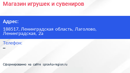 Магазин игрушек и сувениров по адресу 188517, Ленинградская область, Лаголово, Ленинградская, 2а в дальнейшем Организация, размещена в следующих категориях: