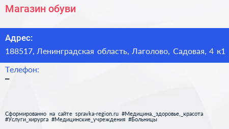 Магазин обуви по адресу 188517, Ленинградская область, Лаголово, Садовая, 4 к1 в дальнейшем Организация, размещена в следующих категориях: