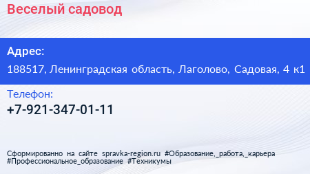 Веселый садовод по адресу 188517, Ленинградская область, Лаголово, Садовая, 4 к1 в дальнейшем Организация, размещена в следующих категориях: