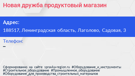 Новая дружба, продуктовый магазин по адресу 188517, Ленинградская область, Лаголово, Садовая, 3 в дальнейшем Организация, размещена в следующих категориях: