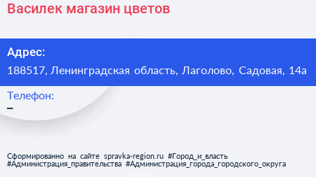 Василек, магазин цветов по адресу 188517, Ленинградская область, Лаголово, Садовая, 14а в дальнейшем Организация, размещена в следующих категориях: