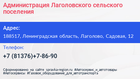 Администрация Лаголовского сельского поселения по адресу 188517, Ленинградская область, Лаголово, Садовая, 12 в дальнейшем Организация, размещена в следующих категориях: