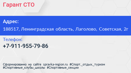 Гарант, СТО по адресу 188517, Ленинградская область, Лаголово, Советская, 2г в дальнейшем Организация, размещена в следующих категориях: