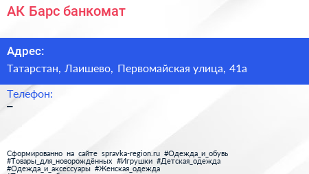 АК Барс, банкомат по адресу Татарстан, Лаишево, Первомайская улица, 41а в дальнейшем Организация, размещена в следующих категориях: