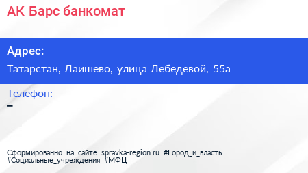 АК Барс, банкомат по адресу Татарстан, Лаишево, улица Лебедевой, 55а в дальнейшем Организация, размещена в следующих категориях: