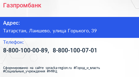 Газпромбанк по адресу Татарстан, Лаишево, улица Горького, 39 в дальнейшем Организация, размещена в следующих категориях: