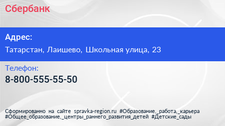 Сбербанк по адресу Татарстан, Лаишево, Школьная улица, 23 в дальнейшем Организация, размещена в следующих категориях: