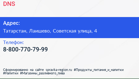 DNS по адресу Татарстан, Лаишево, Советская улица, 4 в дальнейшем Организация, размещена в следующих категориях: