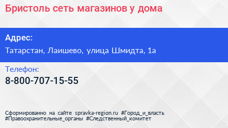 Бристоль, сеть магазинов у дома по адресу Татарстан, Лаишево, улица Шмидта, 1а в дальнейшем Организация, размещена в следующих категориях: