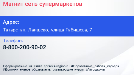 Магнит, сеть супермаркетов по адресу Татарстан, Лаишево, улица Габишева, 7 в дальнейшем Организация, размещена в следующих категориях: