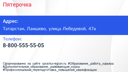 Пятерочка по адресу Татарстан, Лаишево, улица Лебедевой, 47а в дальнейшем Организация, размещена в следующих категориях: