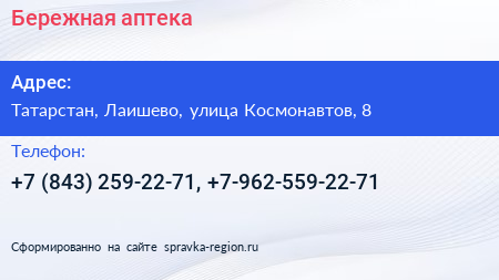 Бережная аптека по адресу Татарстан, Лаишево, улица Космонавтов, 8 в дальнейшем Организация, размещена в следующих категориях: