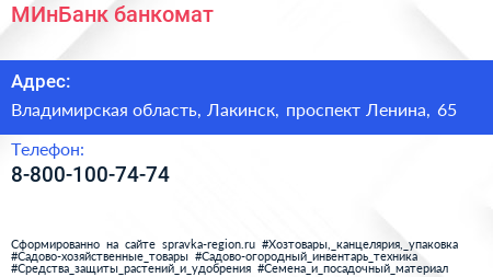 МИнБанк, банкомат по адресу Владимирская область, Лакинск, проспект Ленина, 65 в дальнейшем Организация, размещена в следующих категориях:
