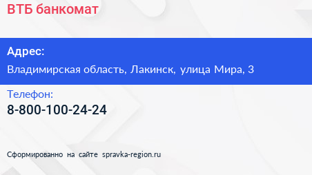 ВТБ, банкомат по адресу Владимирская область, Лакинск, улица Мира, 3 в дальнейшем Организация, размещена в следующих категориях: