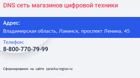 DNS, сеть магазинов цифровой техники по адресу Владимирская область, Лакинск, проспект Ленина, 45 в дальнейшем Организация, размещена в следующих категориях: