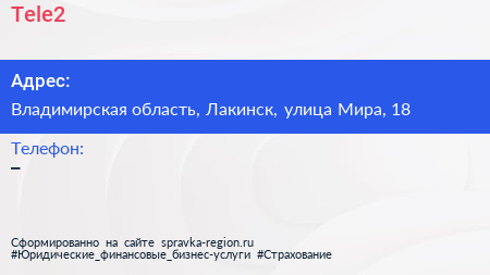 Tele2 по адресу Владимирская область, Лакинск, улица Мира, 18 в дальнейшем Организация, размещена в следующих категориях: