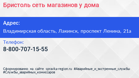Бристоль, сеть магазинов у дома по адресу Владимирская область, Лакинск, проспект Ленина, 21а в дальнейшем Организация, размещена в следующих категориях: