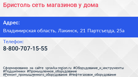 Бристоль, сеть магазинов у дома по адресу Владимирская область, Лакинск, 21 Партсъезда, 25а в дальнейшем Организация, размещена в следующих категориях: