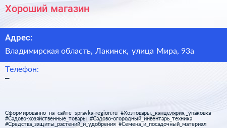 Хороший, магазин по адресу Владимирская область, Лакинск, улица Мира, 93а в дальнейшем Организация, размещена в следующих категориях: